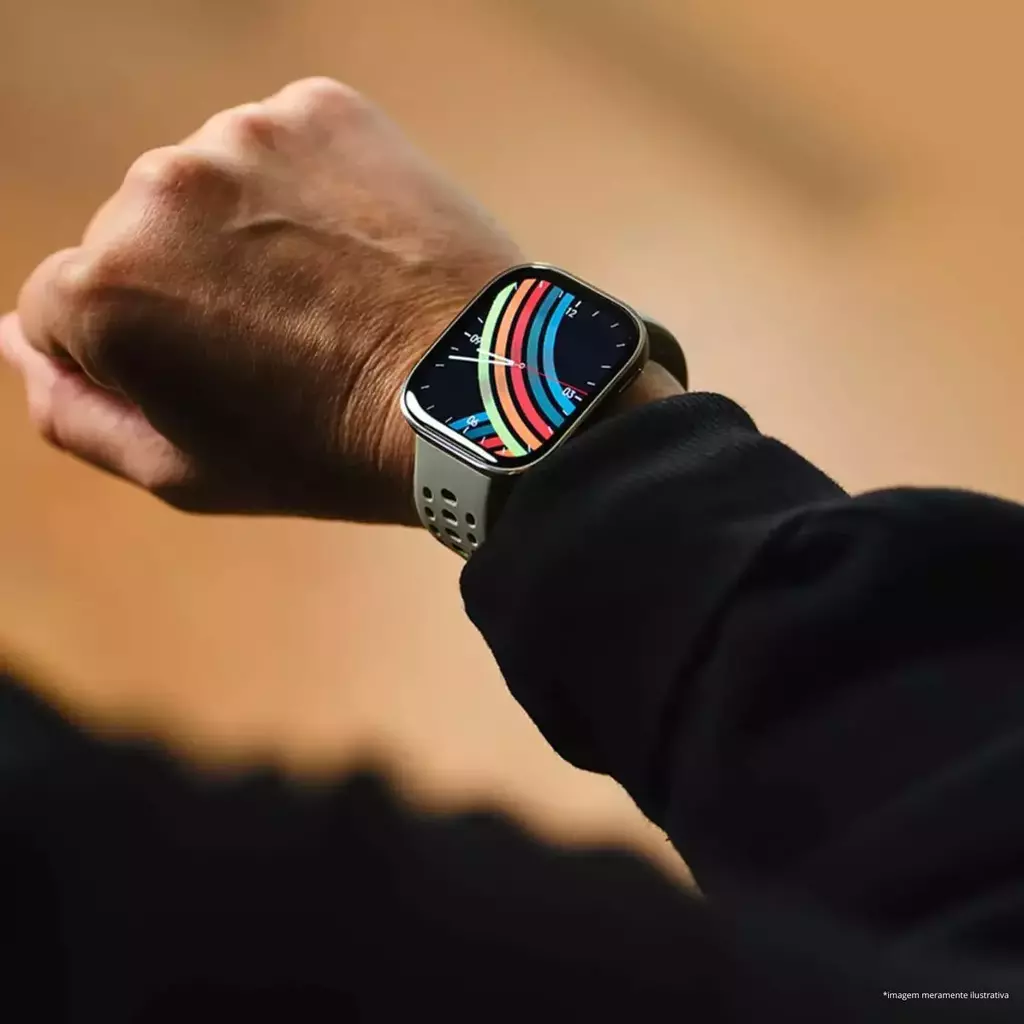 A tela de 1.97 polegadas com AMOLED oferece cores vivas e nítidas, com brilho de até 2000 nits, perfeita para visualizar informações, mesmo sob luz intensa. O design squared (quadrado) é moderno e elegante, combinado com uma pulseira de silicone líquido confortável, que pode ser ajustada para diferentes tamanhos de pulso.